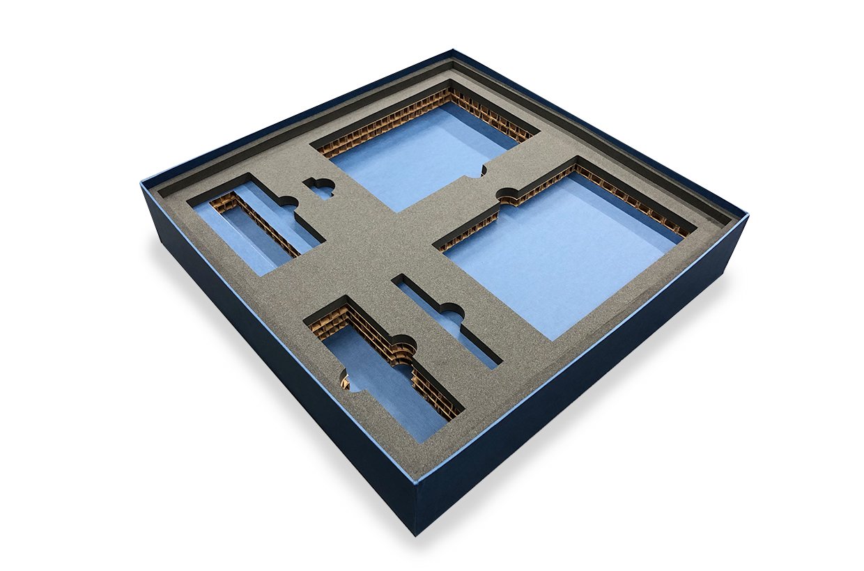 Такие коробки подходят для строительных материалов, небольшие фрагменты которых легко помещаются в отделениях коробки. Также можно предусмотреть место для изображений, текста, различной сопроводительной информации. Существует множество разнообразных способов оформления, в том числе выделение цветом и отдельными блоками.